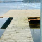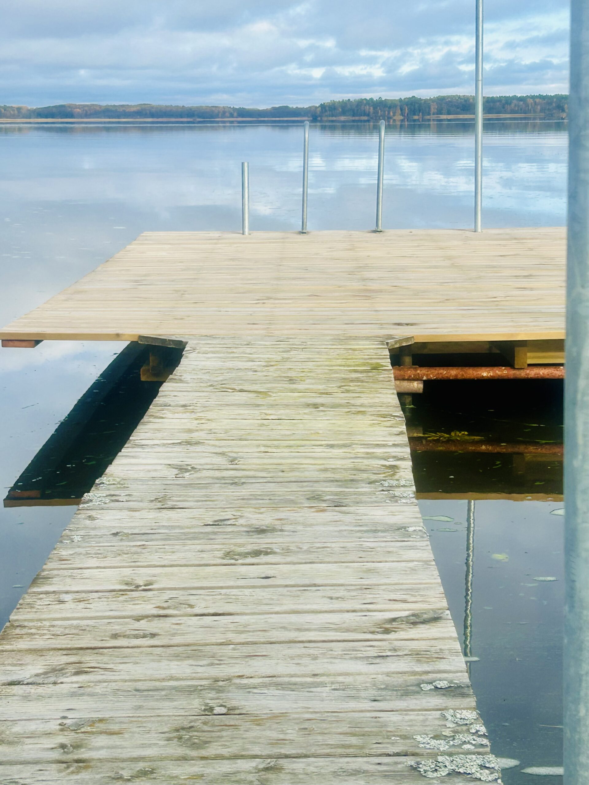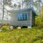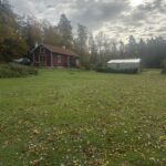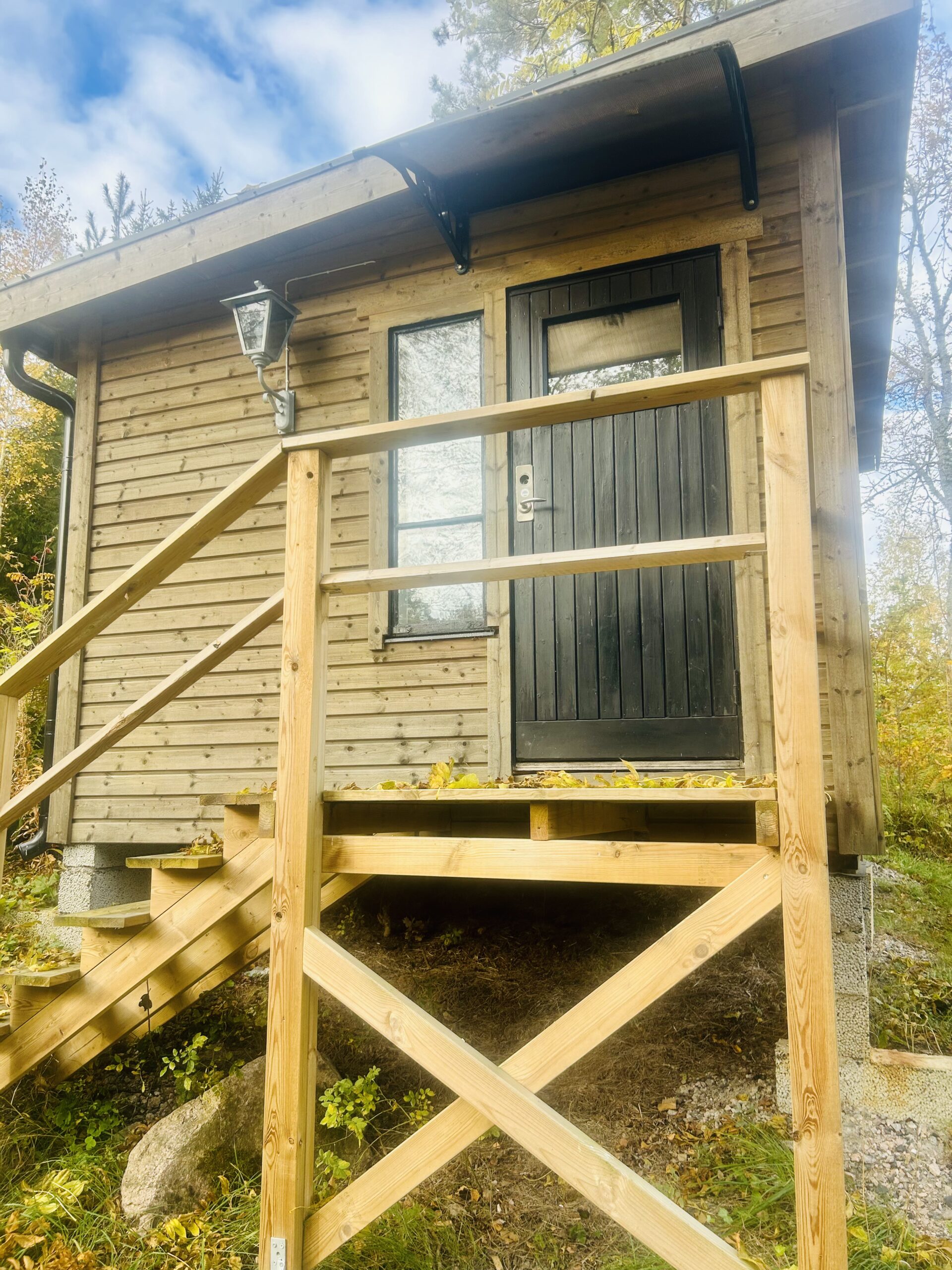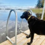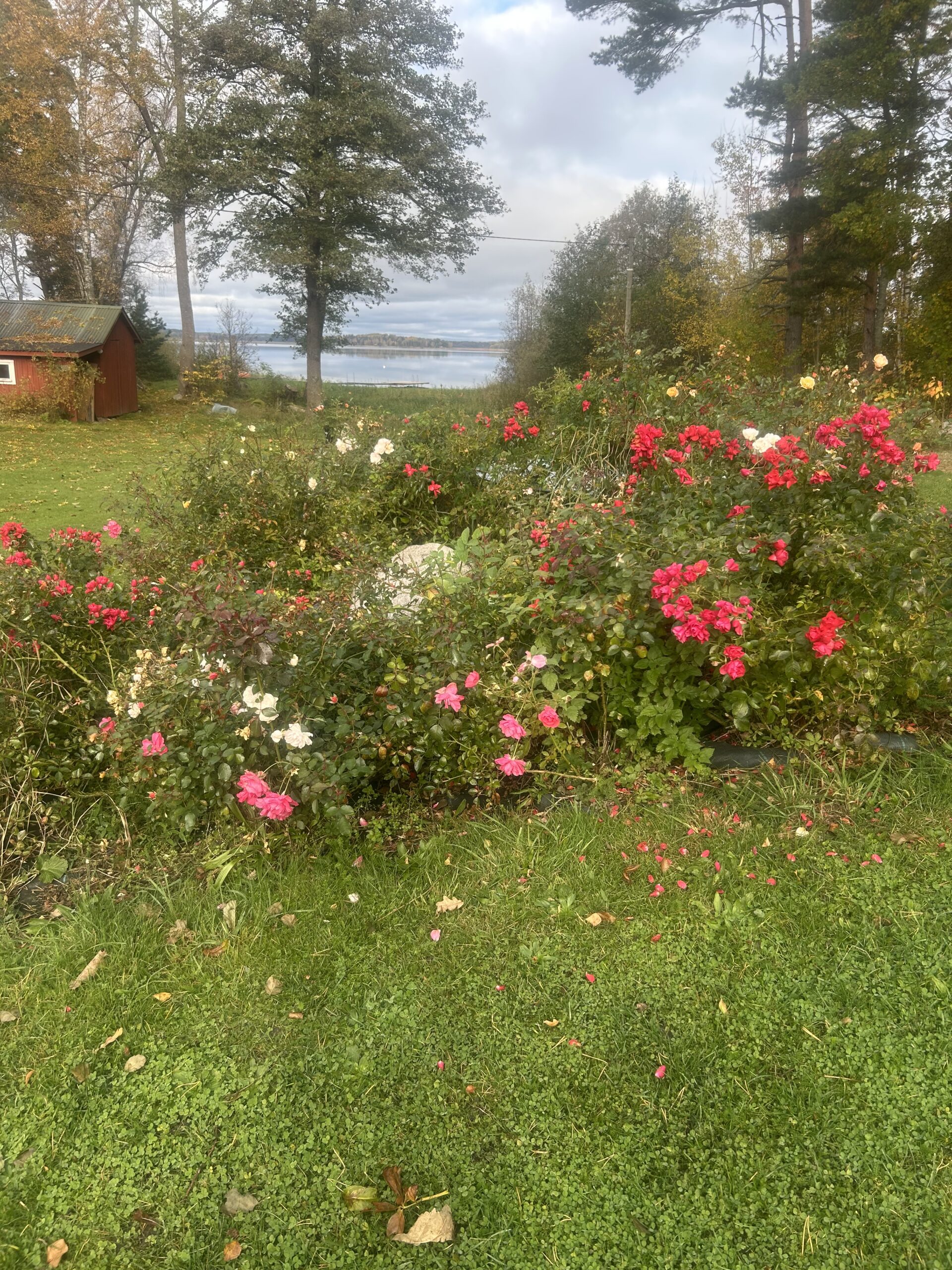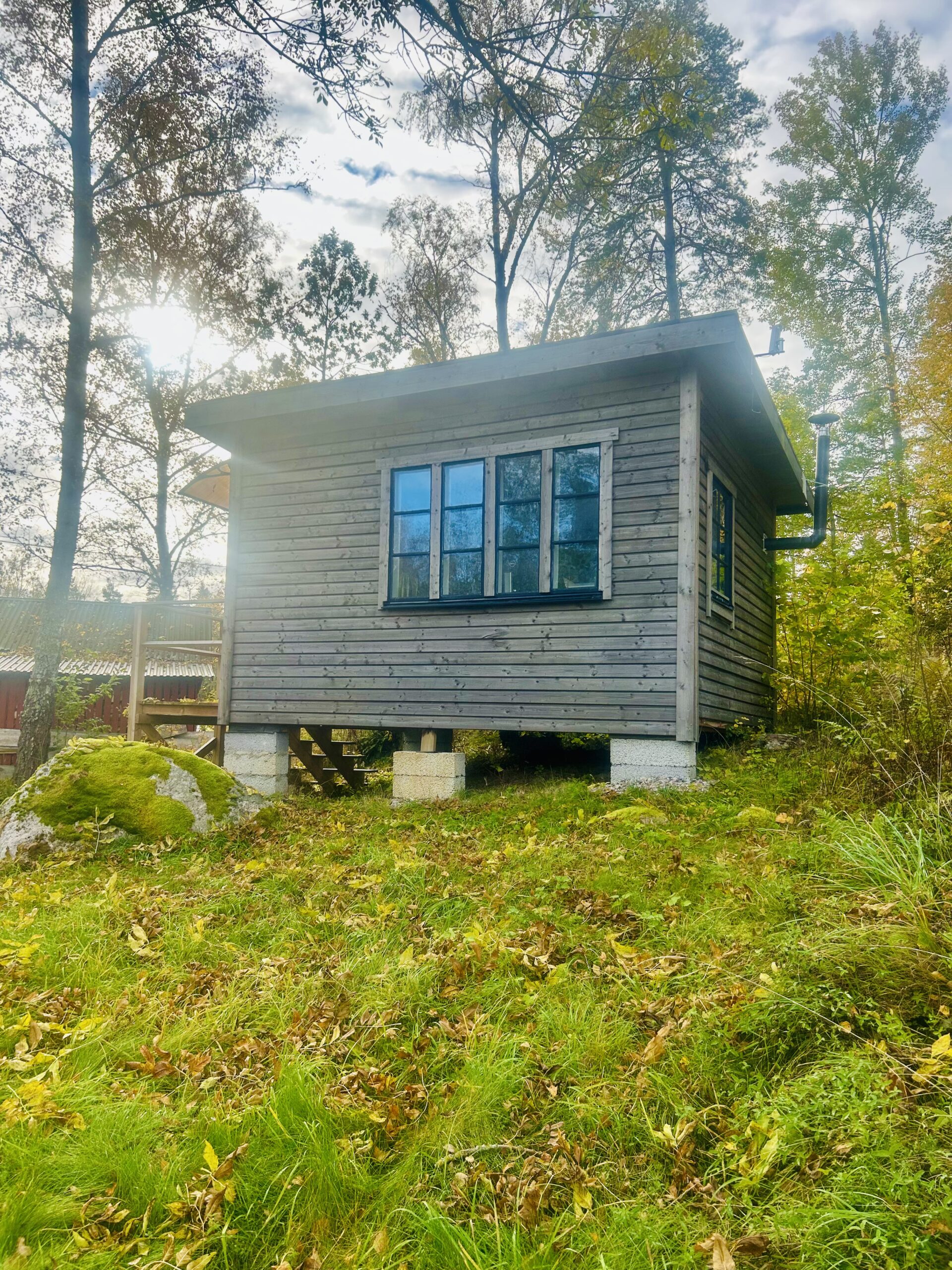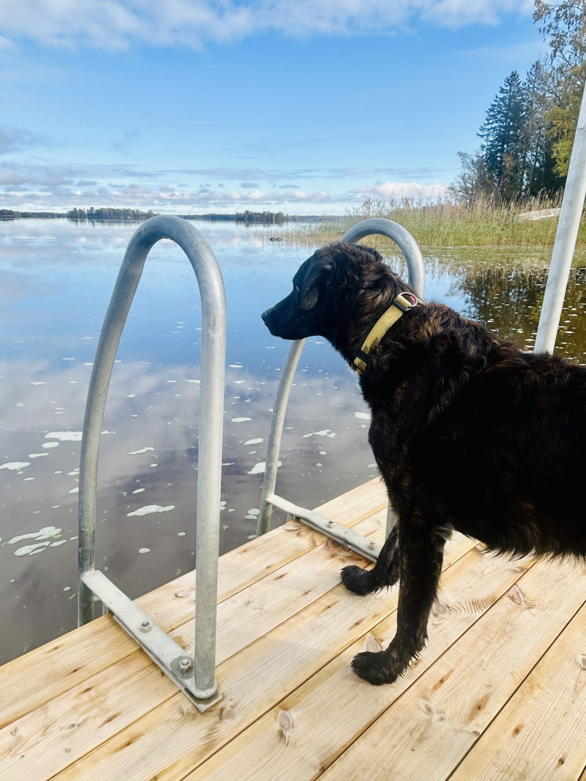 (Bilderna nedan: Bruna stugan med svart dörr, min skrivarstuga där allt skrivande sker. Vår brygga, där mycket tänkande äger rum. Min fina Zigi som håller mig sällskap.)